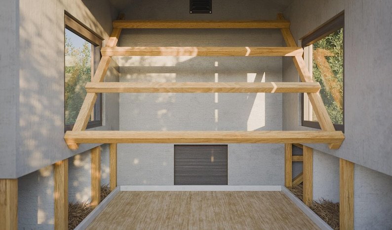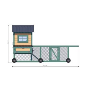 This design is a true chicken mobile—built on six wheels for easy relocation, with sturdy construction to stand up to the elements. The coop features 32 sq. ft. of indoor space with nesting boxes on both sides, plus a 60 sq. ft. aviary for roaming.